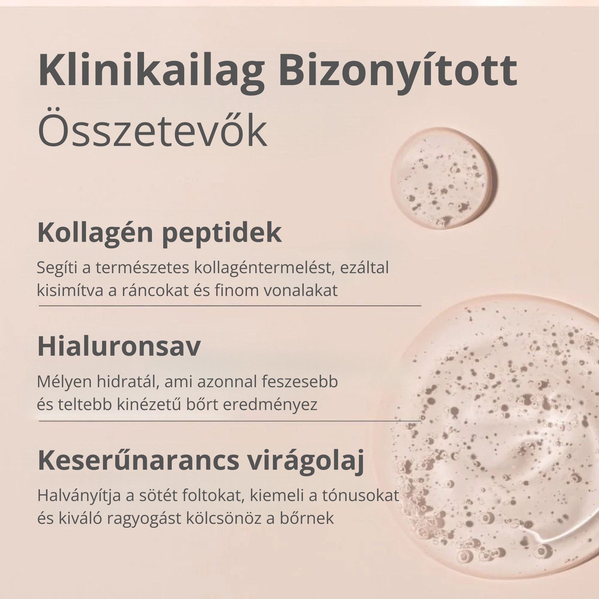 Támogatja a természetes kollagéntermelést a feszesebb kinézetű bőrért. Csökkenti a finom vonalak és ráncok megjelenését. Támogatja a bőr szerkezetét és láthatóan simítja a textúráját.